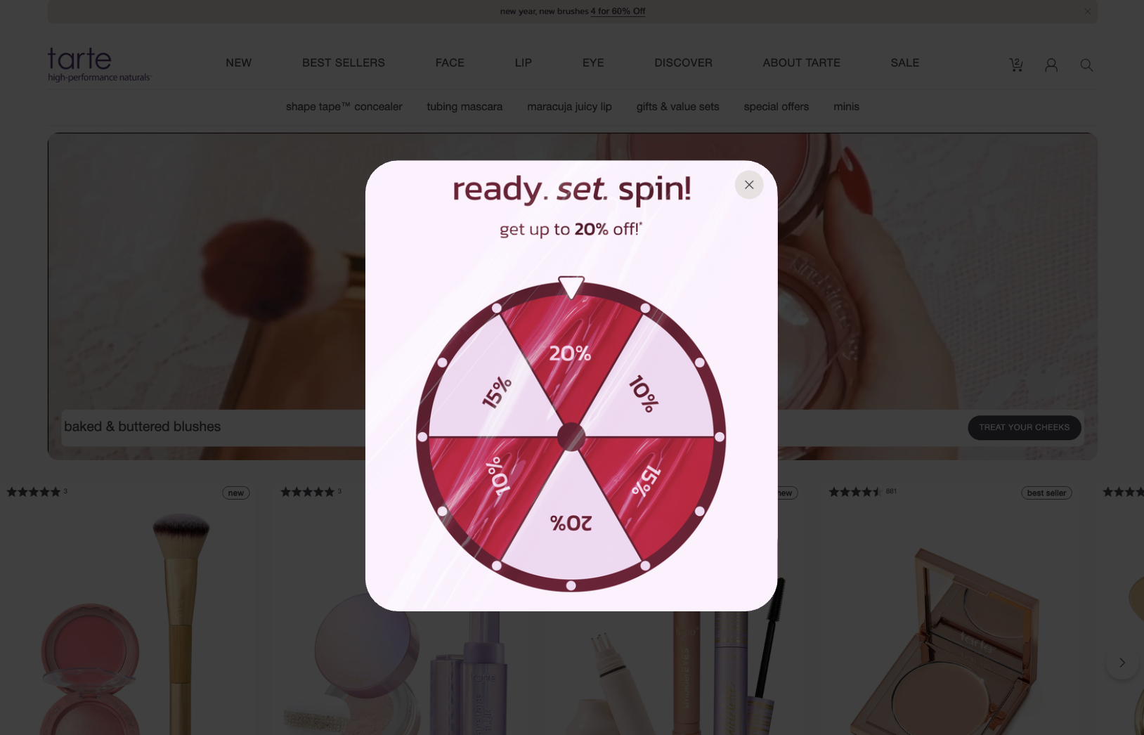 • Spin-to-Win Wheel Website Overlays: Explored variations across three visual directions: bold and graphic, soft and editorial, and product-forward. Refined based on feedback toward designs that balanced conversion-driven UX with the fun, brand-forward visual moment Tarte needed.