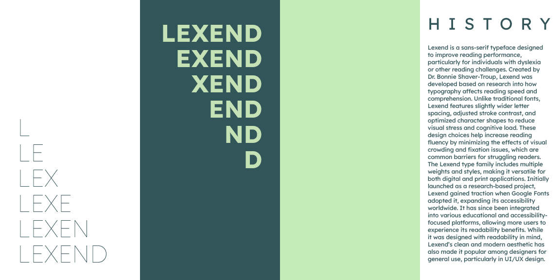 Research + InsightsStudied the origin story of Lexend, including its development by Dr. Bonnie Shaver-Troup and Google Fonts integration, this context shaped every design decision