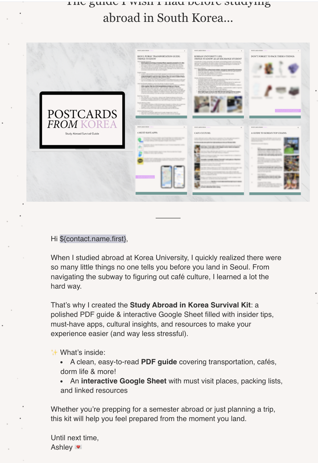 The Study Abroad in Korea Survival Kit is a fully packaged MVP: designed, marketed, and ready for sale on Gumroad.