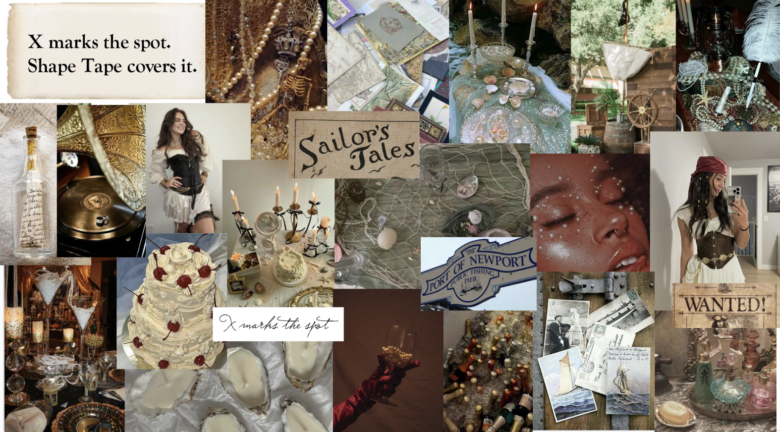 A unique concept inspired by treasure hunts, pirates and hidden gems, playing on the idea that while X marks the spot, Shape Tape covers it. Rich textures, gold highlights, pearls, vintage elements, and deep reds create a sense of discovery, mystery, and treasure.