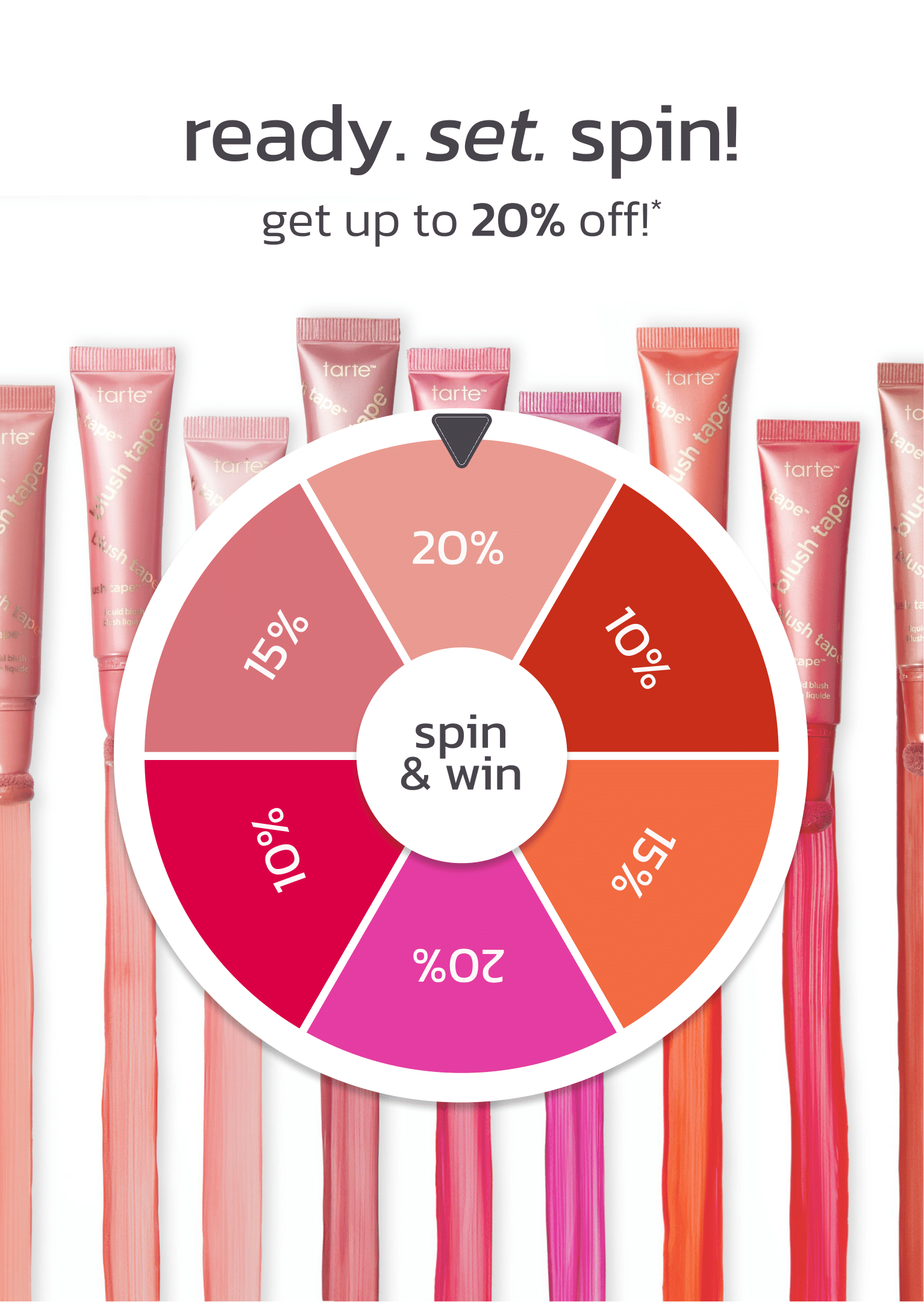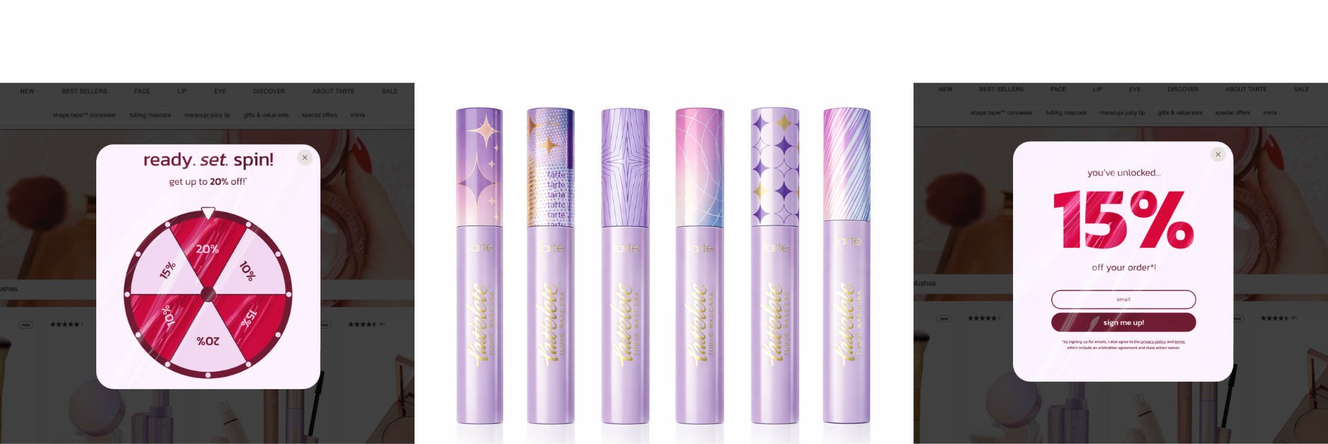 I reviewed previous Tarte executions (shown on the right), researched competitive beauty brands, and explored variations in color, typography, background imagery, and wheel configurations. The goal was to balance conversion-driven UX with a fun, on-brand visual moment that felt exciting rather than transactional.