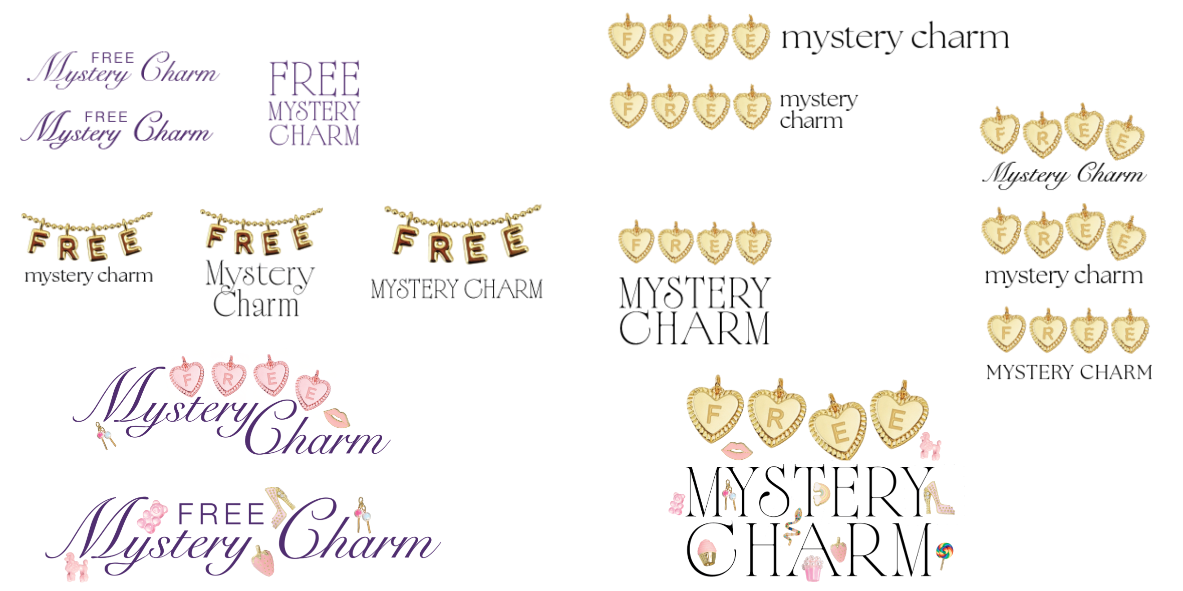 I developed logo concepts for a “Free Mystery Charm” promotion intended for retail gondola displays. This work focused on high-visibility design, legibility from a distance, and playful storytelling.